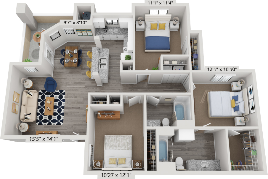 Designed for the critical house hunter searching for comfort, luxury, and intricate space usage, the Sahara is arguably the best floor plan in the Cove Apartments. Featuring three spacious bedrooms and two bathrooms, the Sahara is 1258 square feet of modern contemporary living.